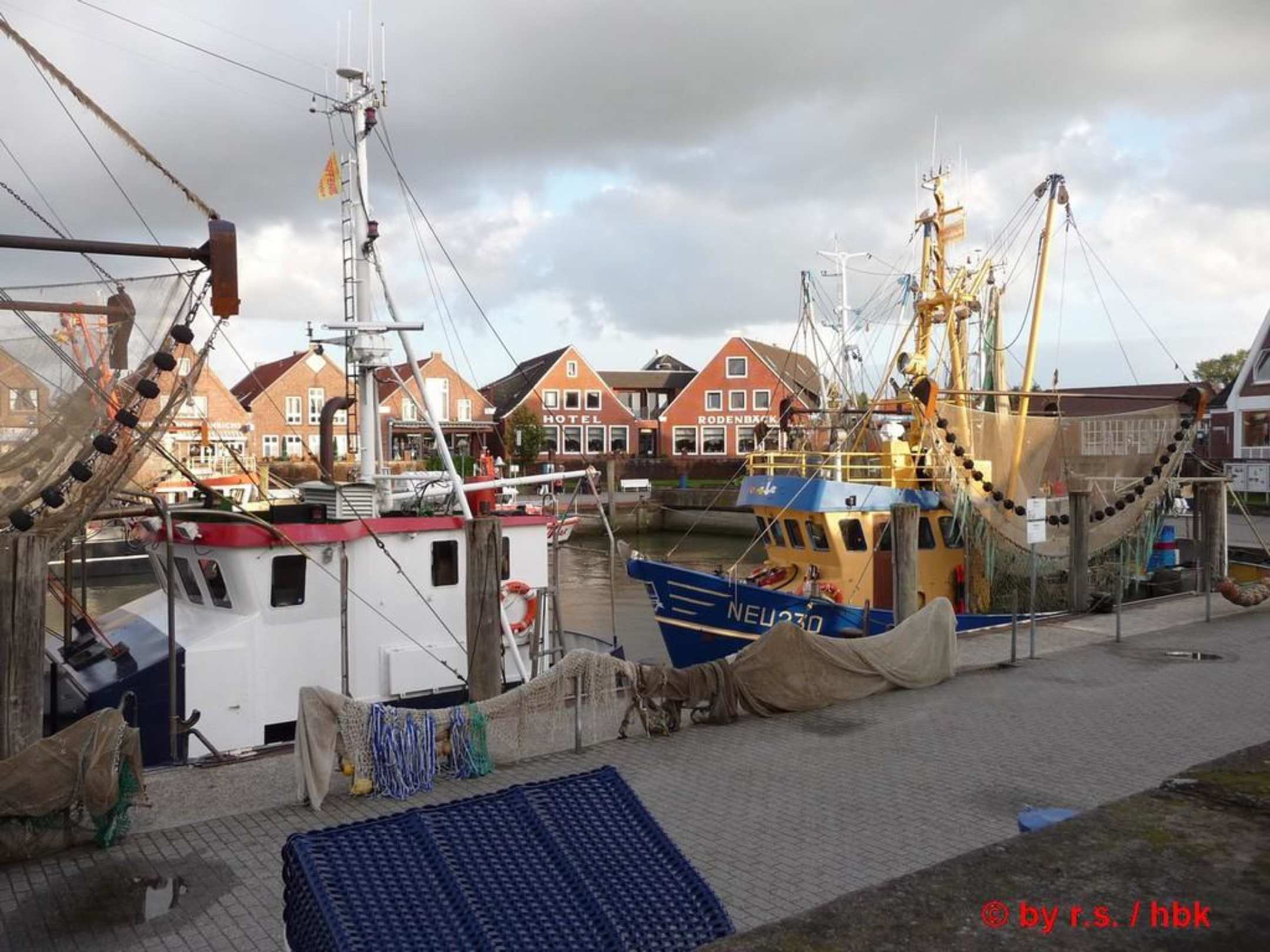 Blick quer übern Hafen, durch die Fischkutter zum Hotel rüber