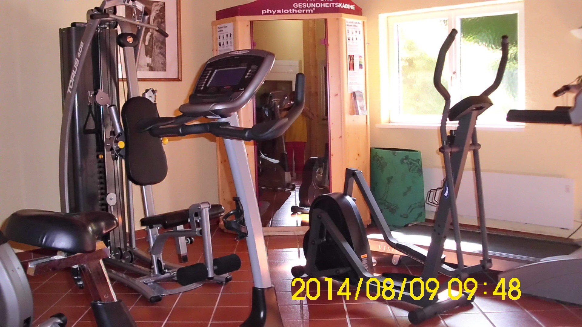 Der Fitnessraum mit Physiotherm Infrarotkabine - beides zusammen irgendwie unpraktisch. Und dazu noch videoüberwacht.
