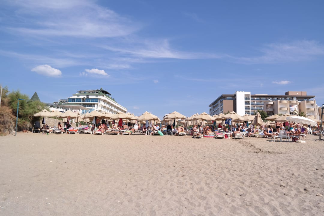 Blick vom Meer zum Hotel (rechts)