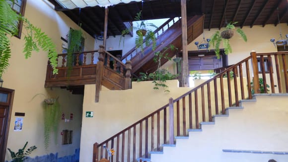 InnenhofDer Freiluft-Innenraum, der manchmal mit Plane abgedeckt ist. Oben in der Mitte befindet sich der Eingang von der Straße, unten ist die Hauptebene mit den beiden Restaurants und der WLAN-Zone, hier geht es dann auch (quasi rückwärts) zur Terrasse.