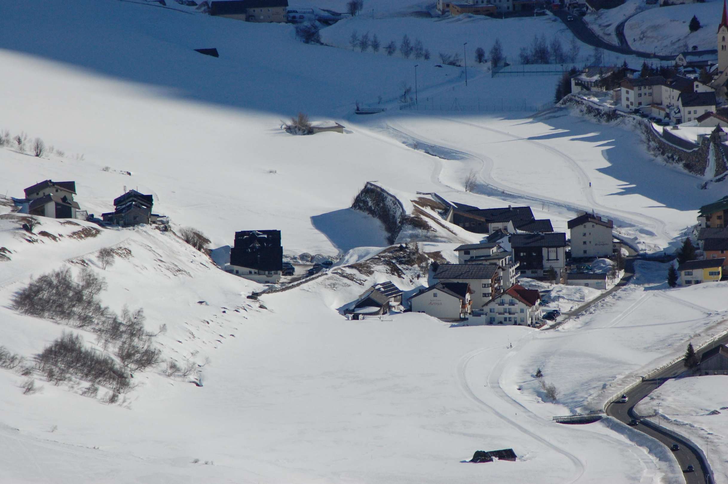 Hotel Sabine aus der VogelperspektiveHier ist das Hotel Sabine in der Mitte des Bildes mit dem Parkplatz zu sehen, Aufnahme aus dem Skigebiet.