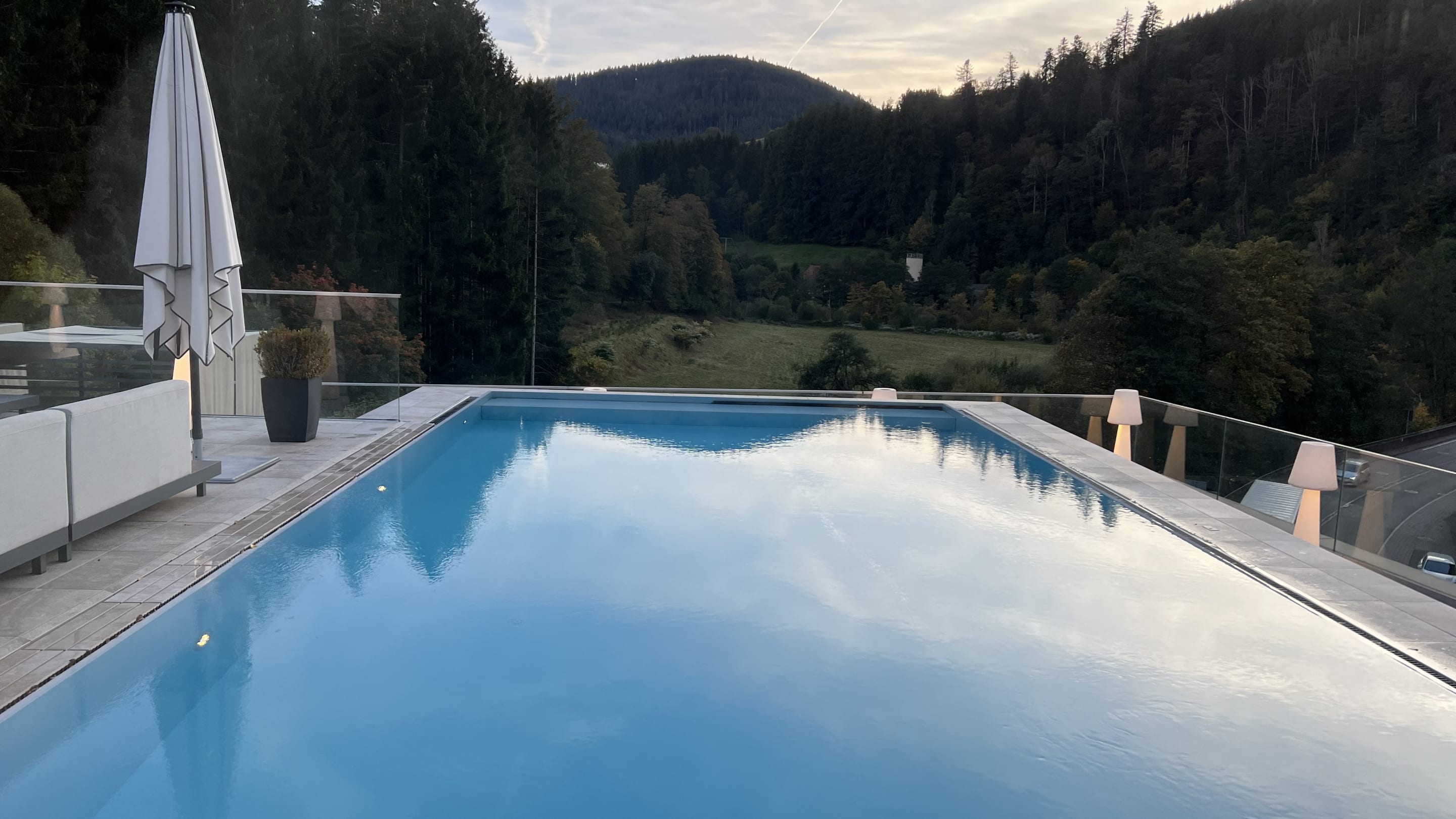 Infinity-Pool auf der Dachterrasse in der Abenddämmerung