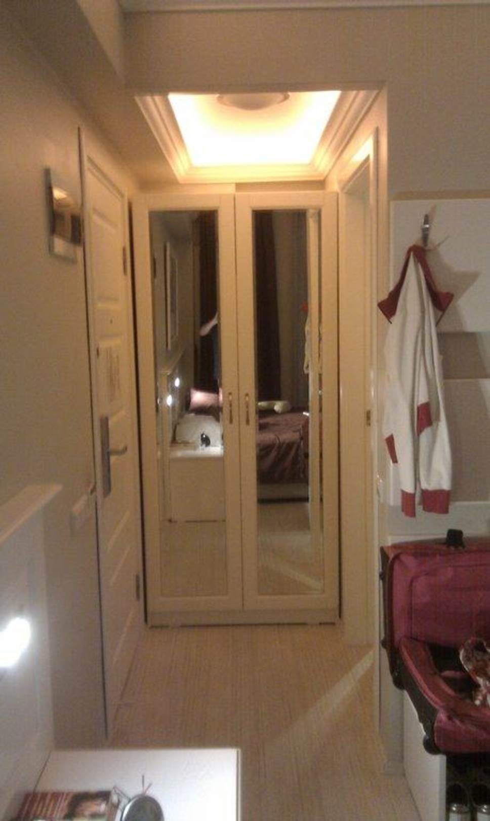 Blick vom Bett zum Schrank, links Eingangstür, rechts Bad