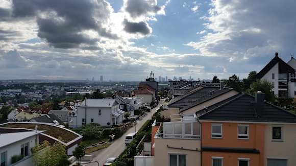 Im Hintergrund die Hochhäuser im Zentrum von Frankfurt