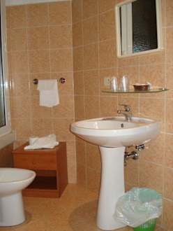 Das Waschbecken und Bidget. Auf der kleinen Kommode haben wir unseren Koffer abgestellt. Im Zimmer selbst, gab es keine Möglichkeit den Koffer liegend zu lagern.