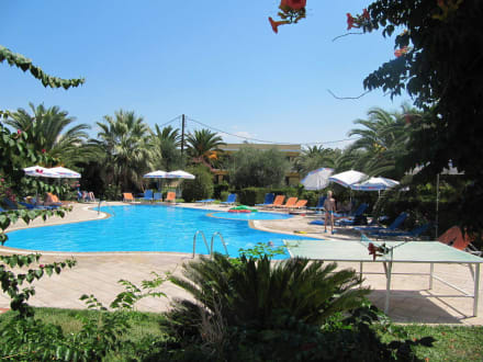 Blick von der Restaurant-Terrasse auf Garten/Pool