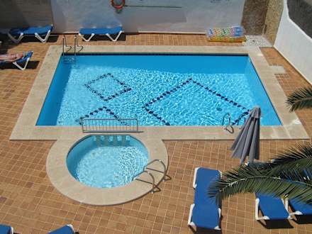 Blick direkt vom zimmer auf den pool