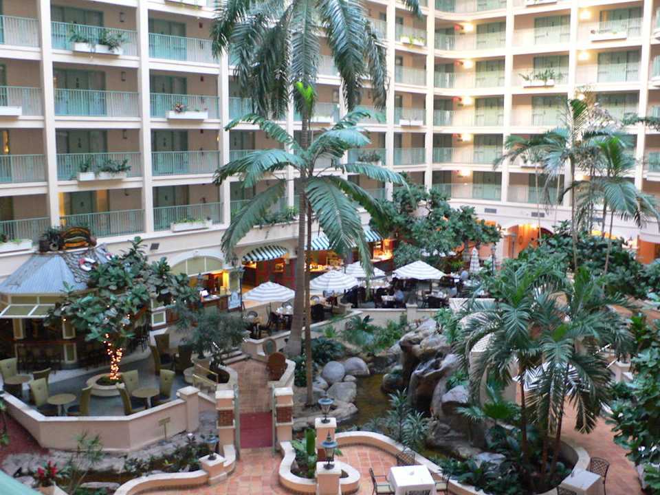 Atrium mit Wasserfall und Restaurant Hotel Sheraton Suites Cypress Creek