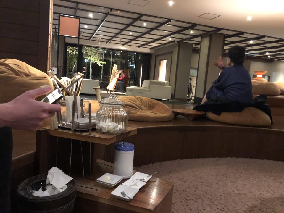 Hier in der Lobby kann man am Ofen Marshmellos braten und die Harfenmusik geniessen.
