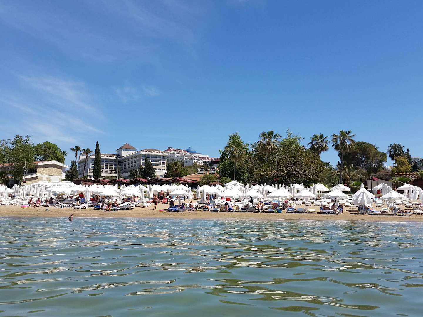 Strand und Hotel vom Wasser aus