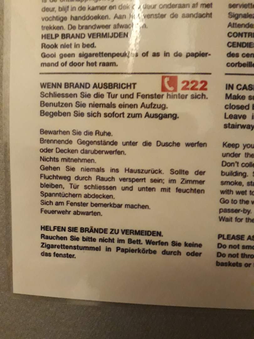Sicherheitshinweis an der Zimmertür. Da es sich um ein Nichtraucherhotel handelt verwundert der Hinweis, dass man Zigaretten in den Papierkorb oder aus dem Fenser (!!!!) schmeißen soll.