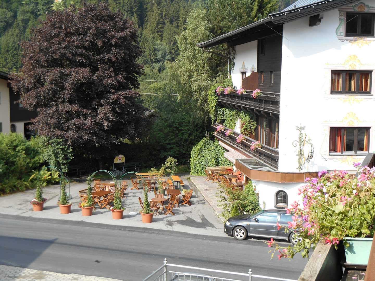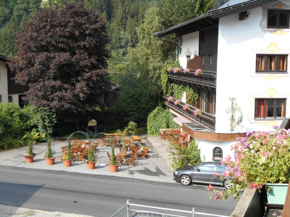 Blick vom Nebengebäude zum Restaurant