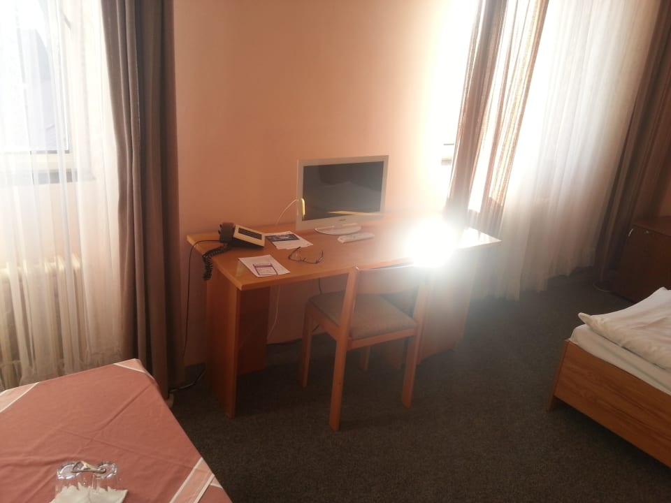 Schreibtisch und kleiner TV-Bildschirm