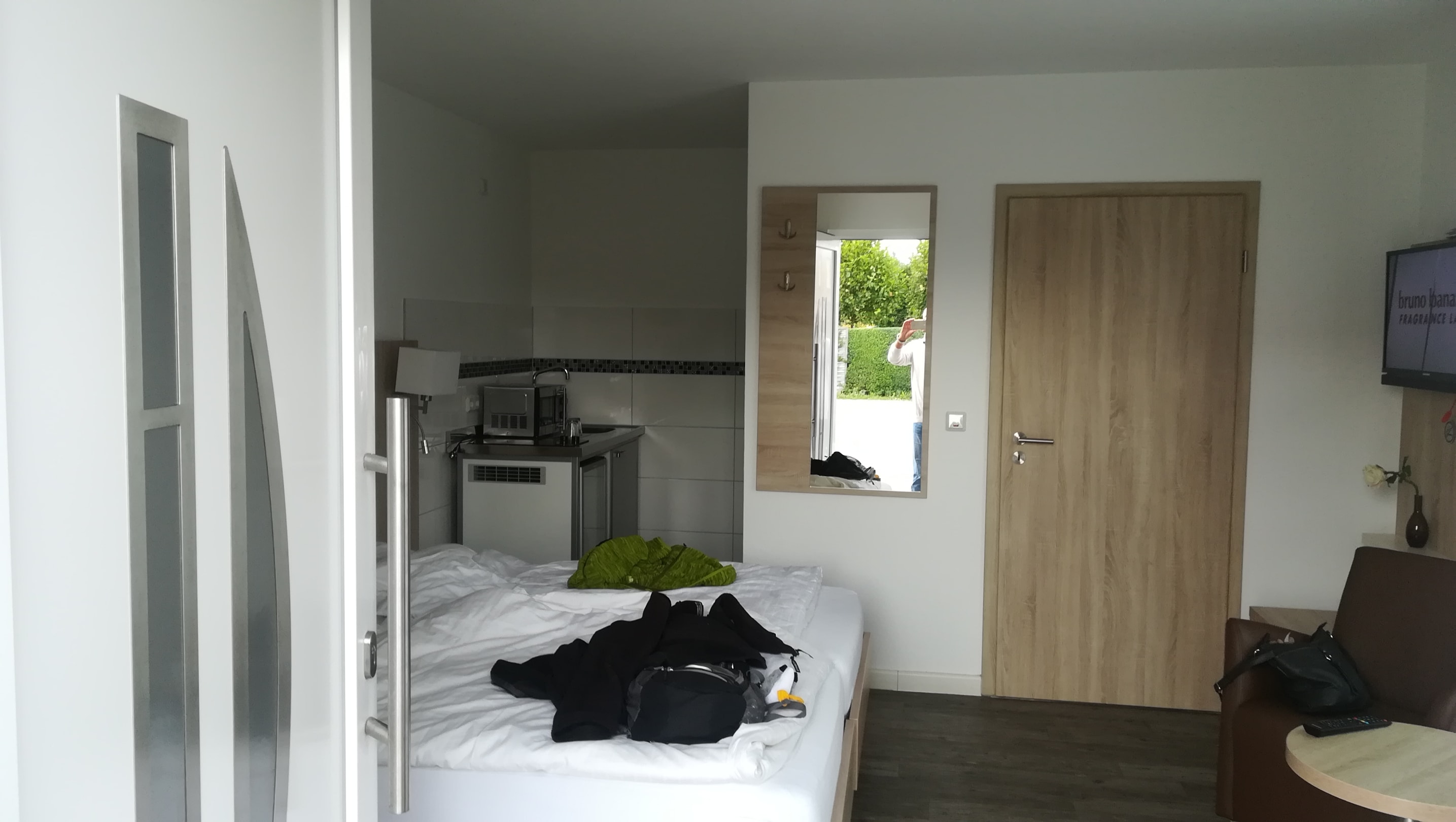 Zimmer mit TV und kleiner Küchenzeile
