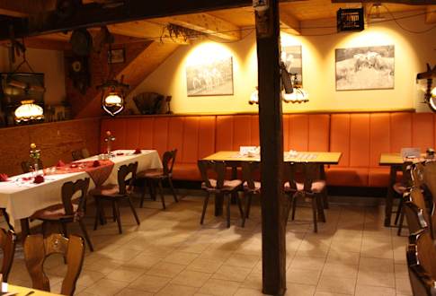 Neu gestalteter Gastraum mit Kaminfeuer
