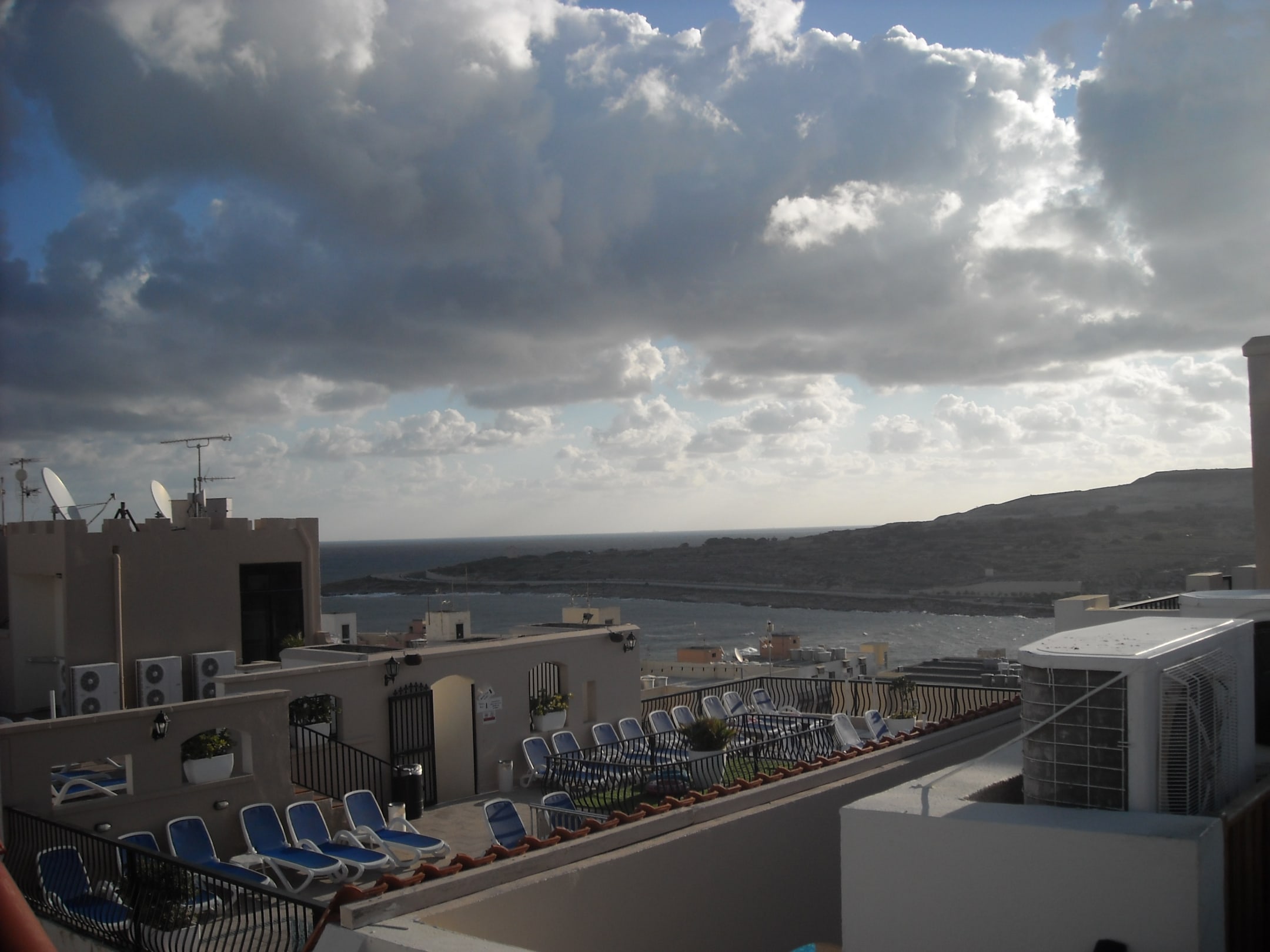 Die Sonnenliegen auf der Dachterrasse