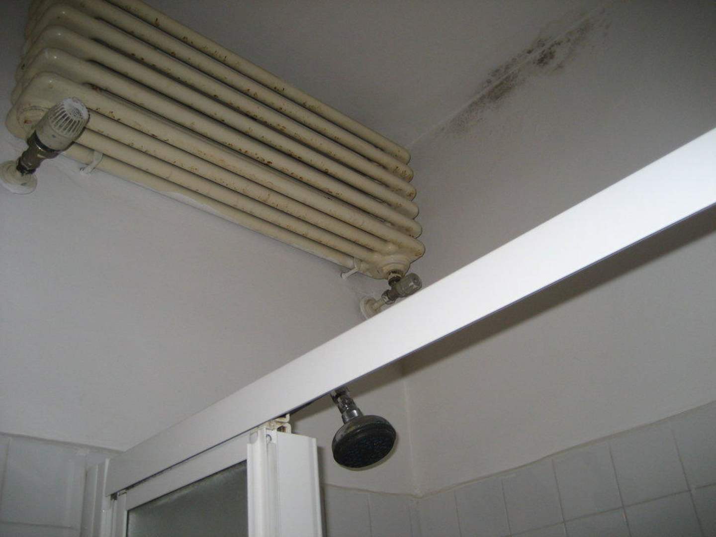 Schimmel und Dreck in der DuscheEine Heizung über dem Duschkopf total verdreckt. Daneben Schimmel an der Wand, schon sehr ausgebreitet.