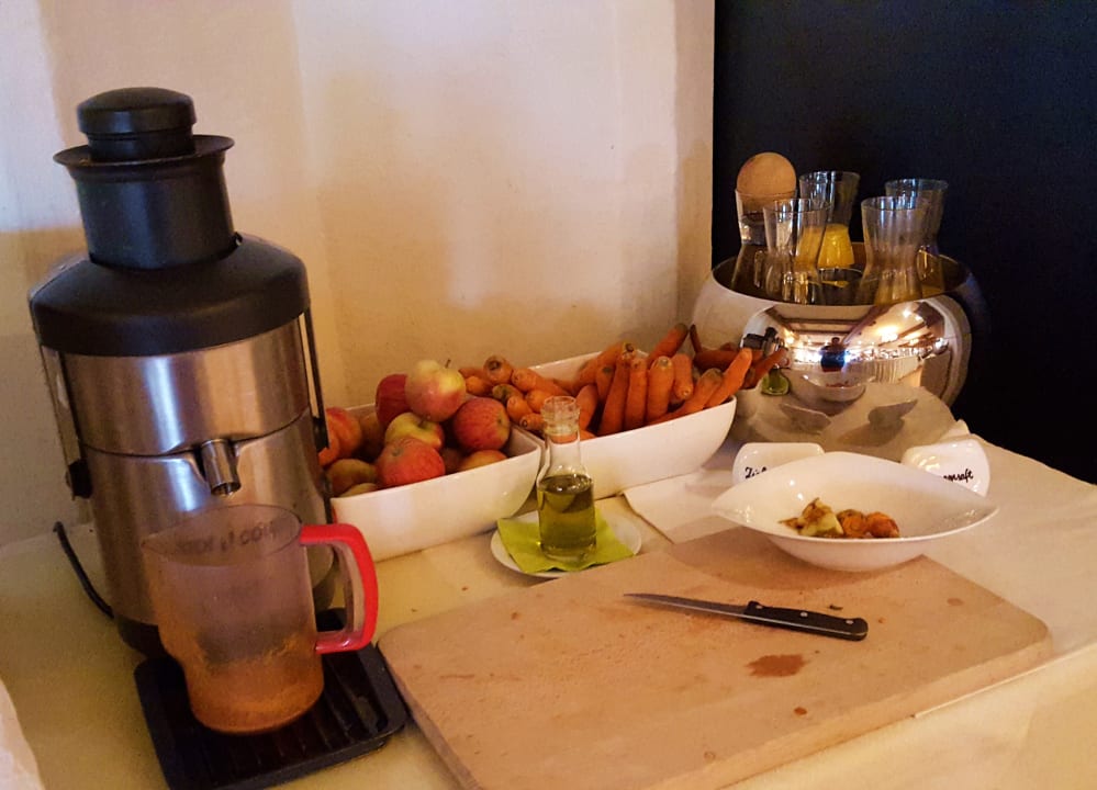 Entsafter zum selbstständigen Getränke zubereiten oder Karaffen mit Wasser und Orangensaft.