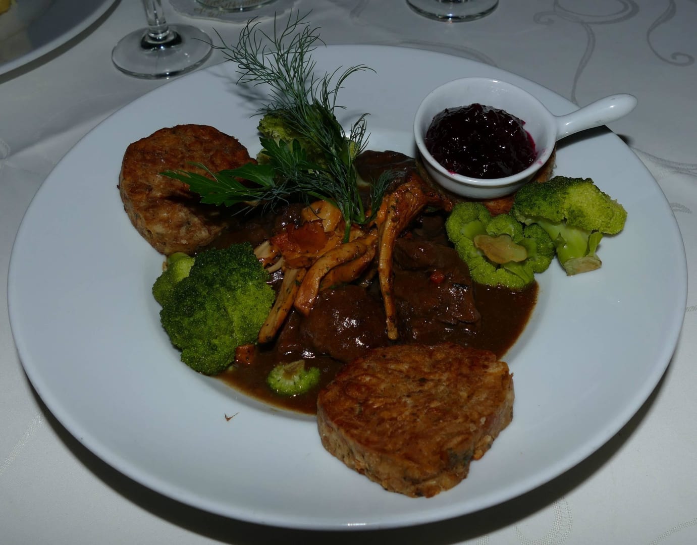 Ragout vom Reh,Pfifferl, Broccoli,Brezen-Serv.knöi