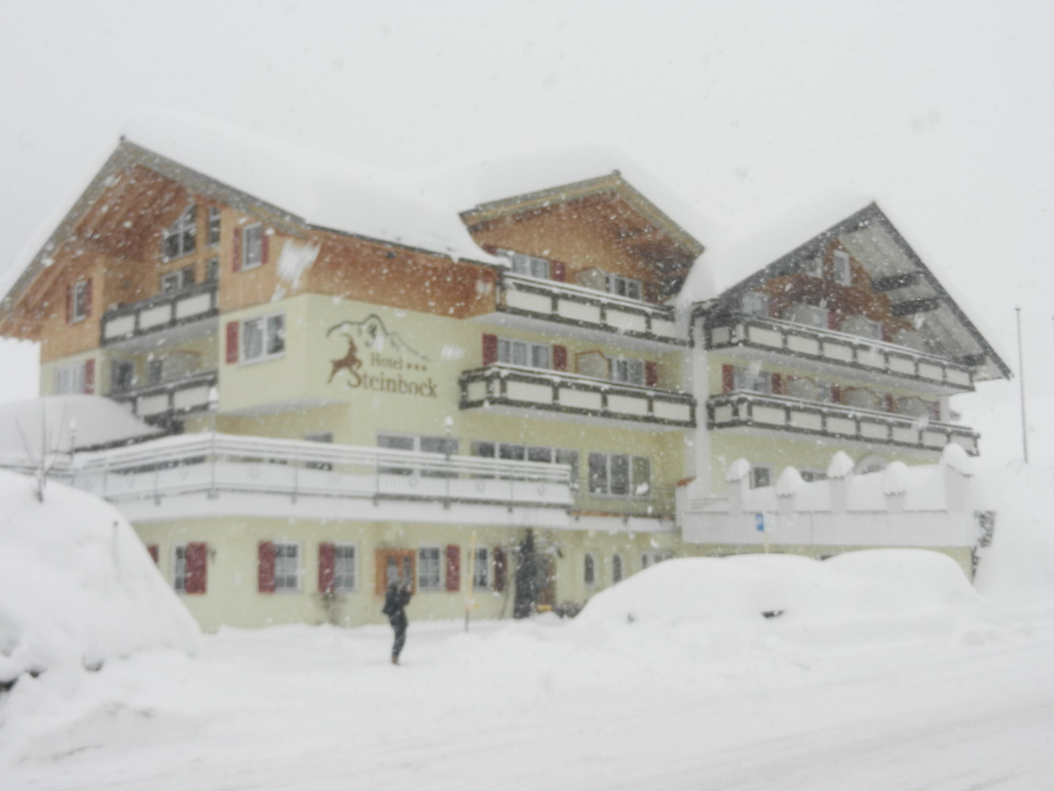 Es schneit "ein wenig". Das Hotel von der Busstation aus gesehen.