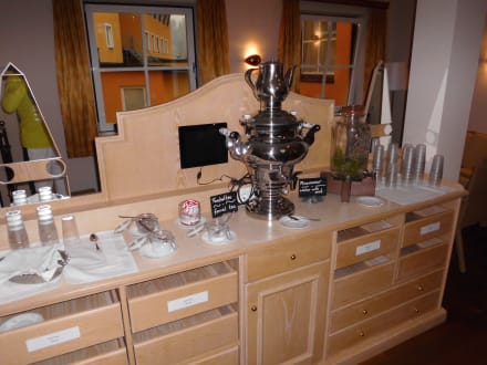 Die Teebar mit einem gesetzten Tee im Samowar und Quellwasser.