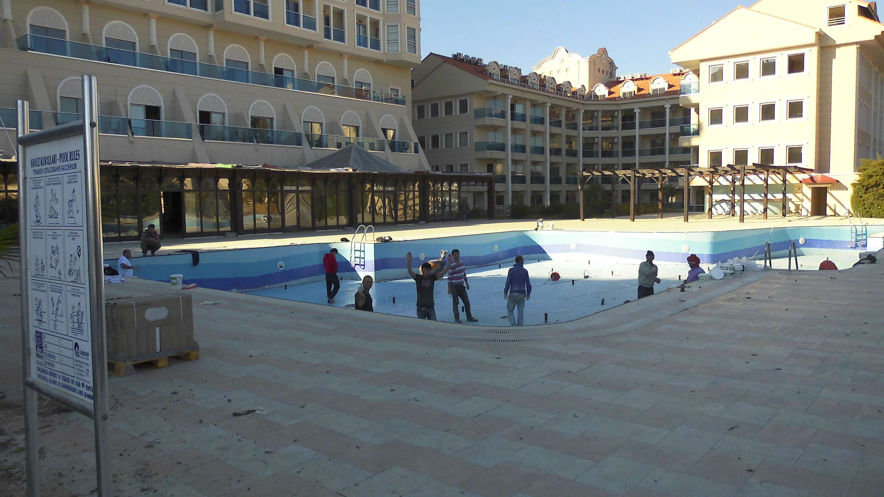 Gerade wird die Poolanlange neu verfliest