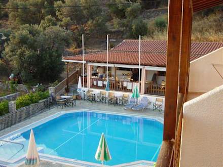 Blick vom Zimmer über den Pool zur Bar