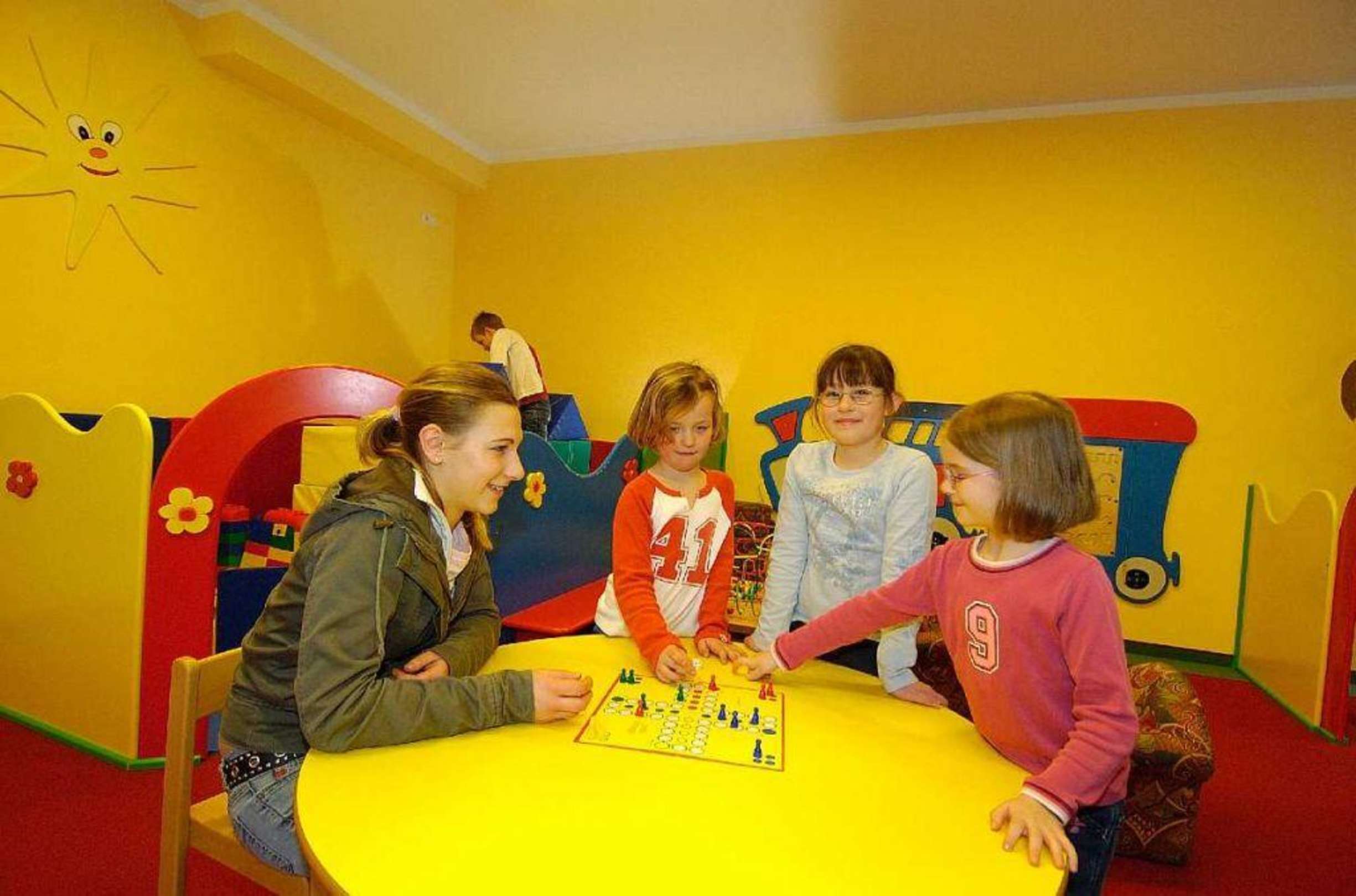 Großes Kinderspielzimmer mit Jugend- und Kleinkinderbereich.