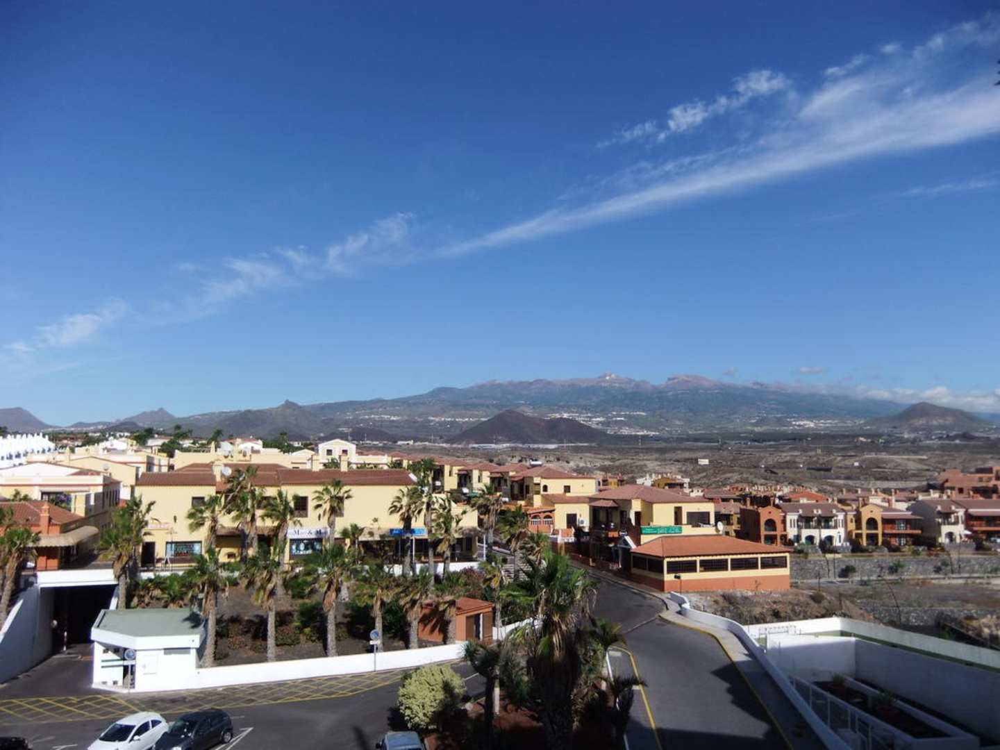 im Vordergrund ein Teil des Parkplatzes und das Centro Commercial (in Teilen); im Hintergrund die Berge, darunter der Teide, der höchste Berg Spaniens.