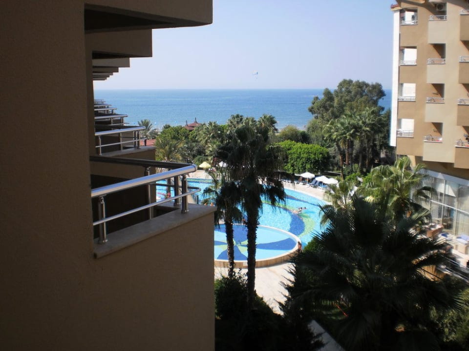 Blick vom Balkon auf den Innenhof mit Pool und Meerblick