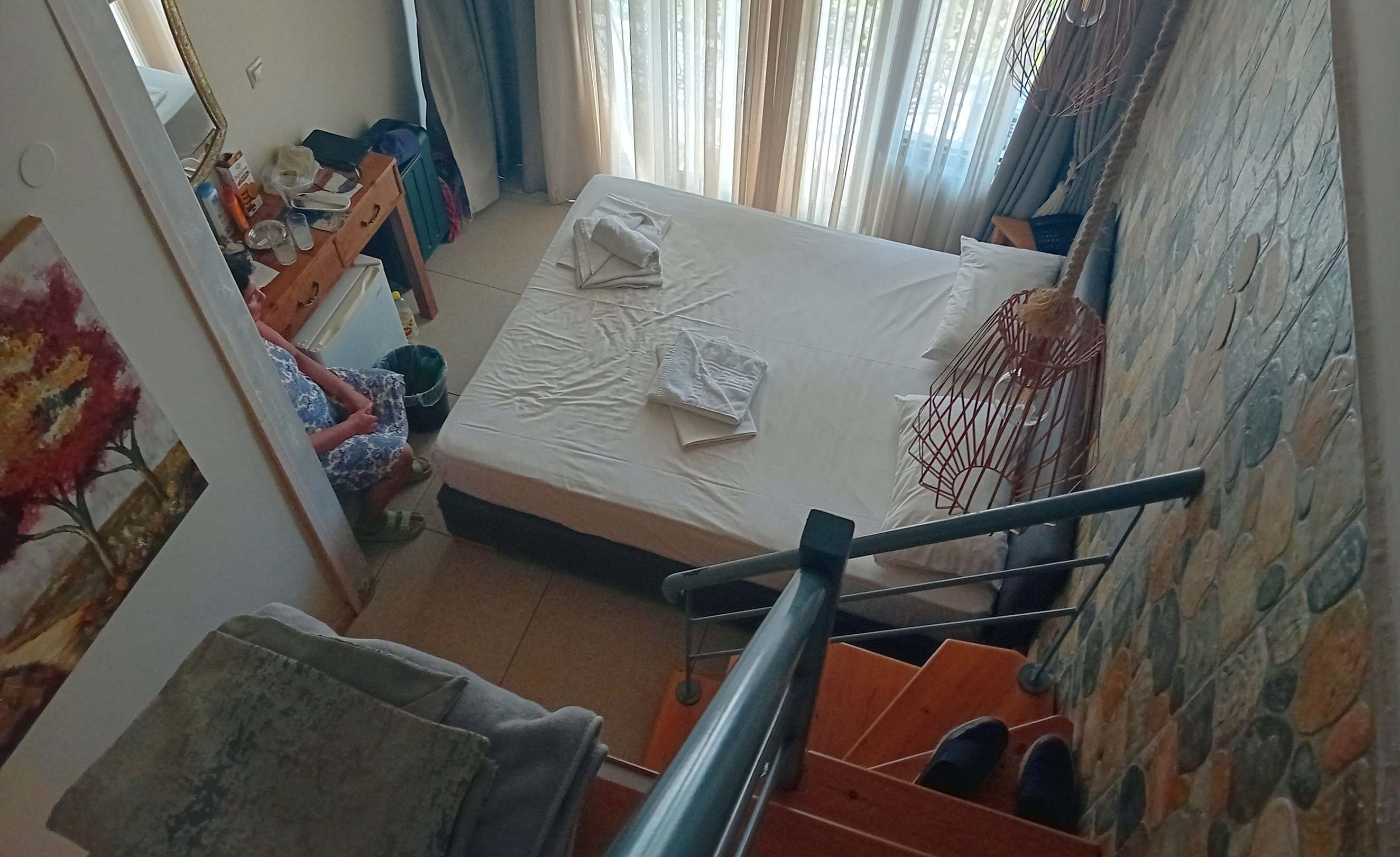 Das war das komplette Zimmer! Die im Bild sichtbare Treppe führt zu einer mit einer dritten und ansonsten nicht nutzbaren Schlafstelle (Matratze) auf einer Galerie mit ca. 1 m Deckenhöhe