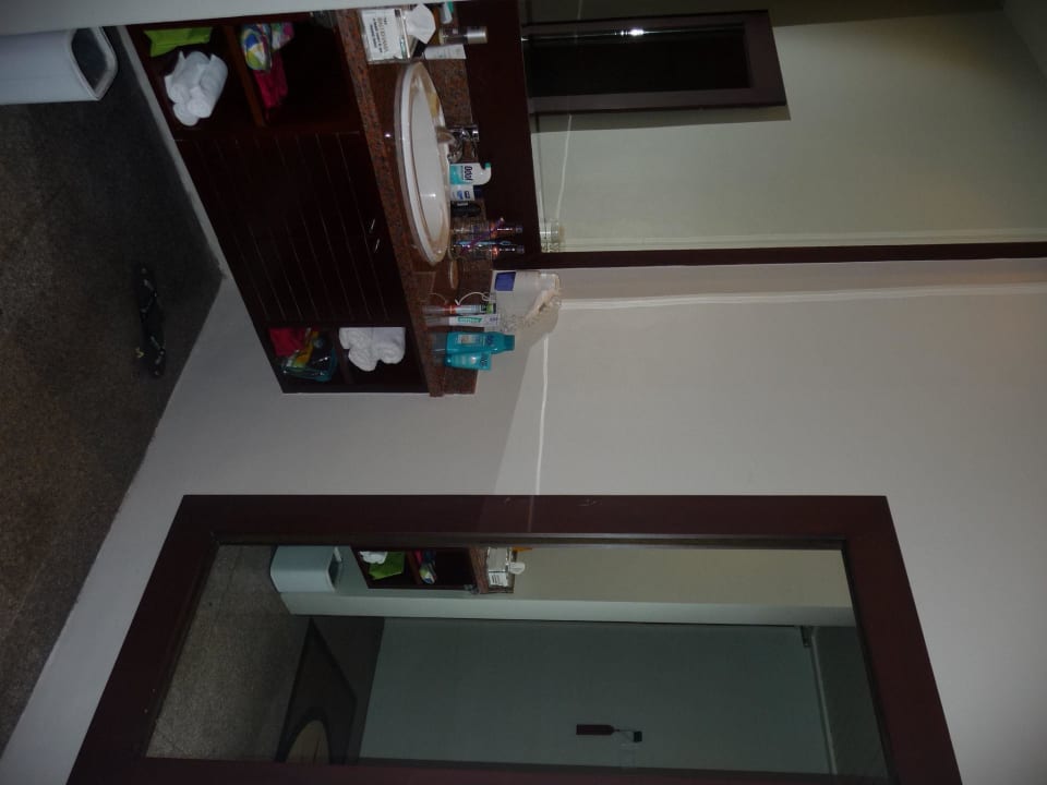 Außer dem großen Spiegel über dem Waschtisch hängt zusätzlich neben dem Waschtisch ein fast raumhoher Spiegel. Unter dem Waschtisch war eine ausreichend große Ablagefläche.