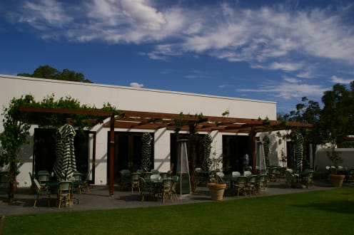 Rezeption und Restaurant mit Außenterrasse.