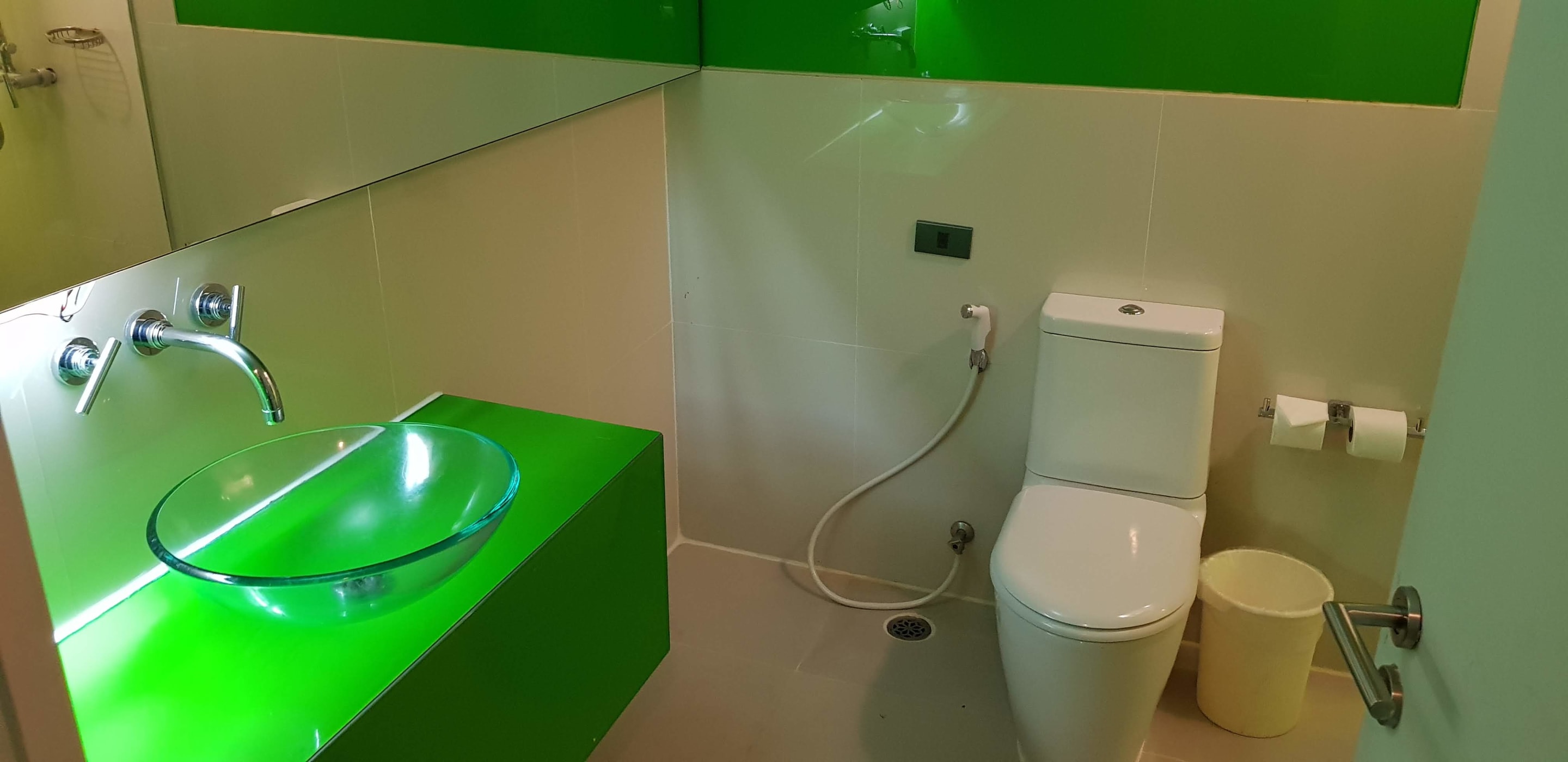 Waschbecken, großer Spiegel und WC.