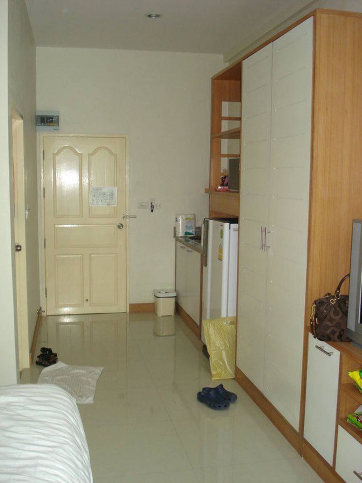 Flur ,ZimmerKleiderschrank mit Safe, Sidboard mit Mikrowelle, Spüle, Links gehts zur grorräumigen Toilette und Dusche