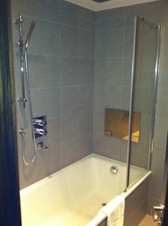 Badewanne, Regendusche, TV (die silberne Platte)