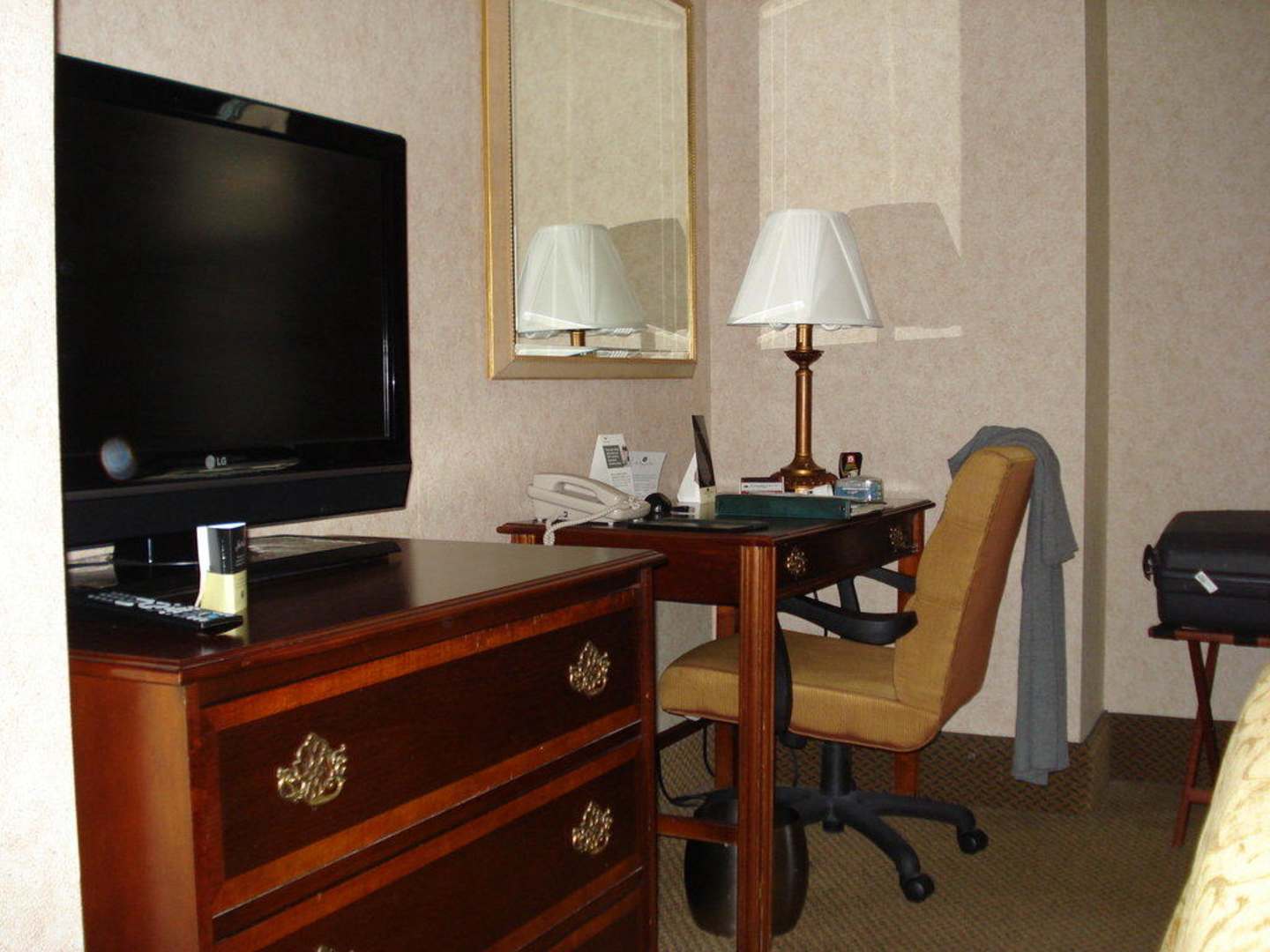 SchreibtischSchreibtisch mit Netzwerkzugang für Laptop, Sessel, Holzkommode und Flachbildfernseher 32 Zoll im Hotelzimmer