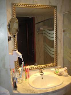 Fön, Kosmetikspiegel und Steckdose am Waschbecken