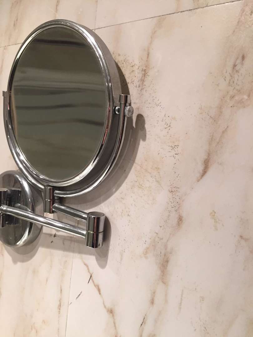 Alte Zahnpastareste auf den Wänden und den Spiegel