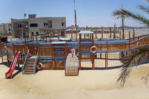 Das ist der letzte, strandnahe Teil des Gebäudes, vom Theater des Titanic Beach aufgenommen, im Vordergrund der Piratenschiff- Spielplatz
