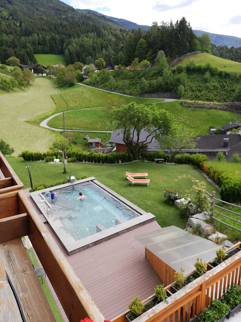 Blick vom Zimmer auf den Außenpool