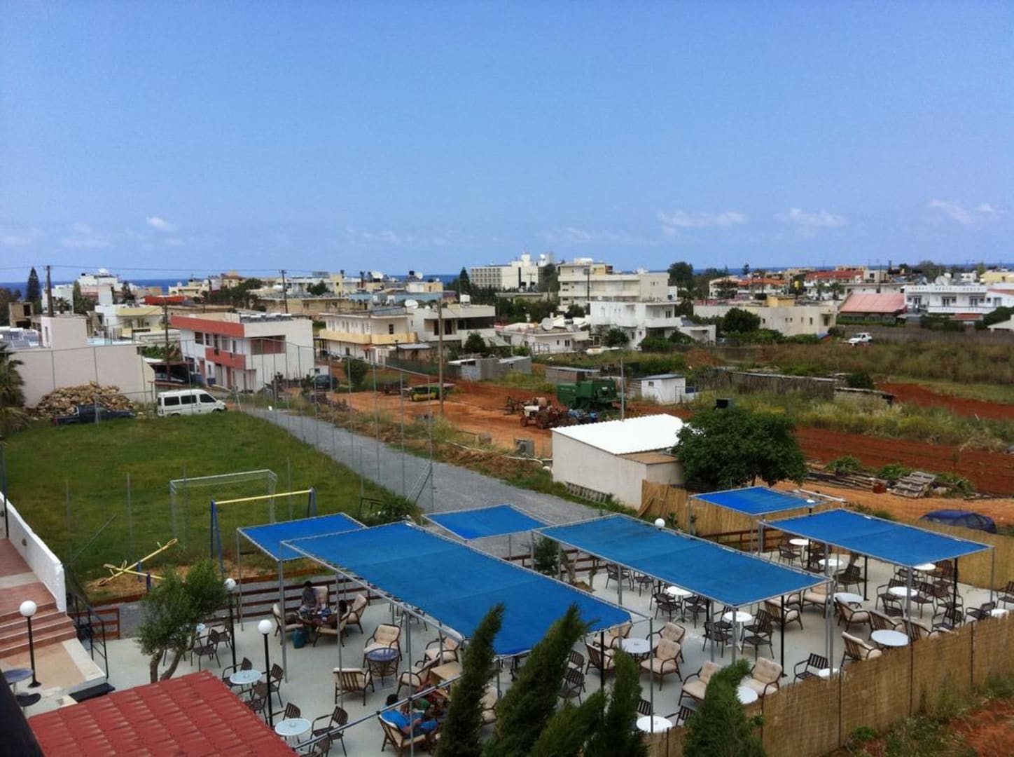 Das ist der Blick von unserem Zimmer auf die Stadt Malia und die Sitzecke des Hotels.