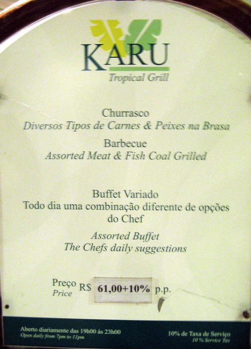 Rundgang im Hotel Tropical ManausDieses Schild weist vor dem Restaurant (am Pool) auf das abendliche Buffet hin.