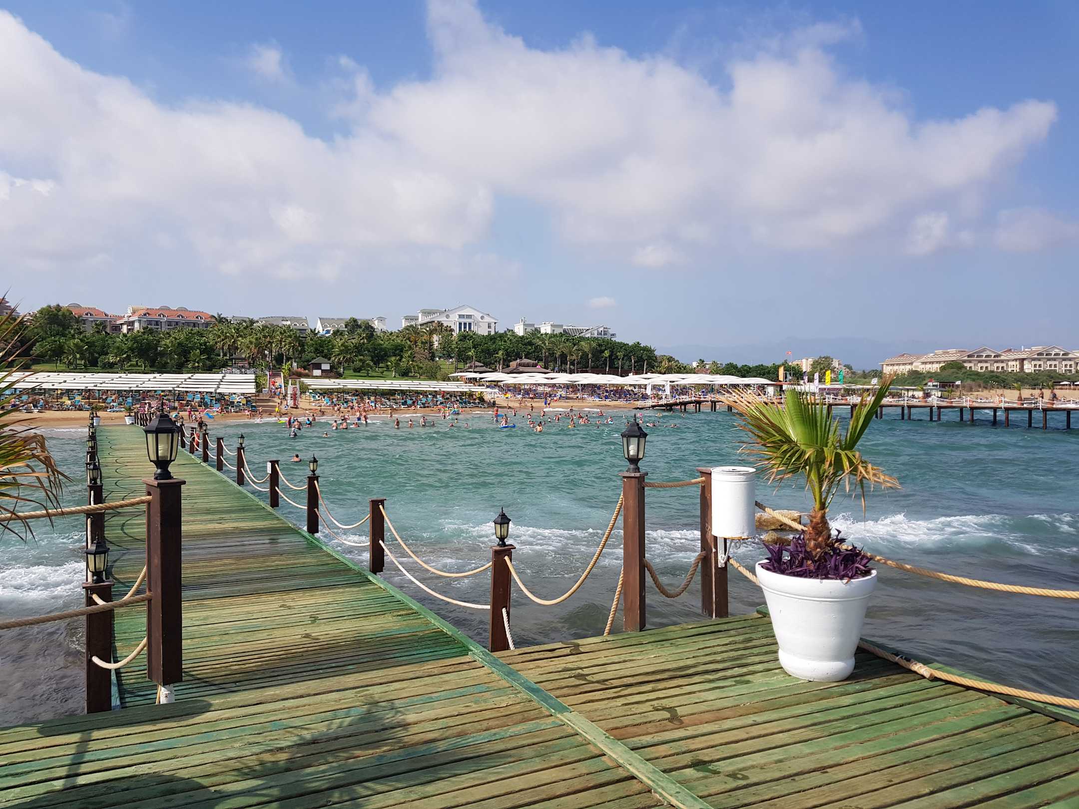 Blick vom Steg zum Strand und Hotel