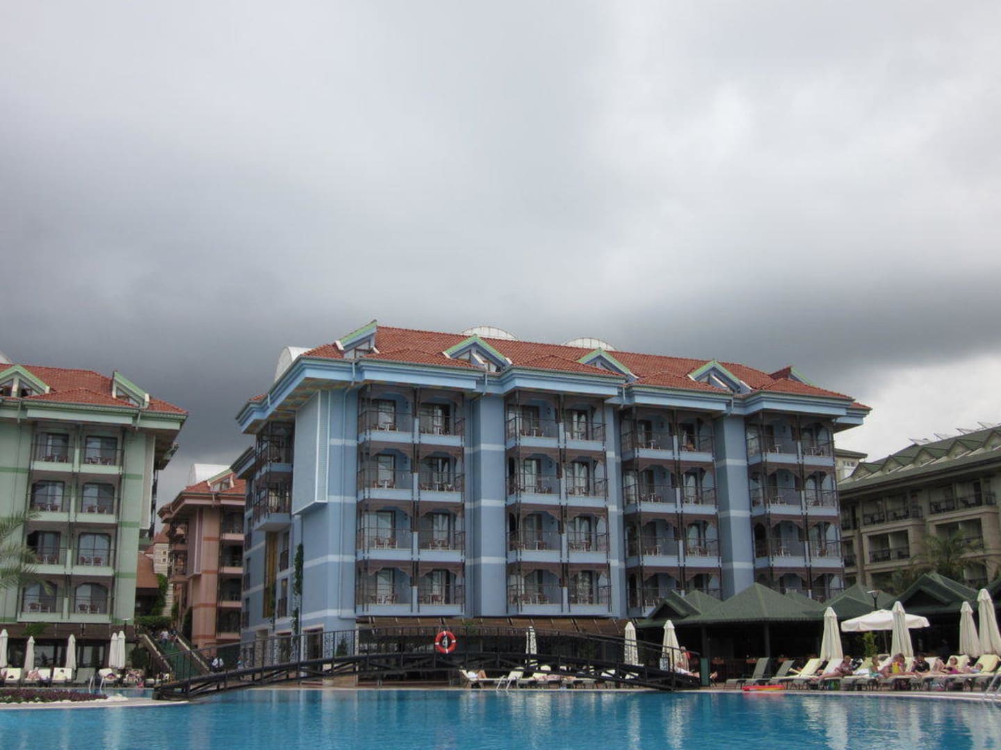 Schicke Aussicht von der Liege auf Pool und Hotel