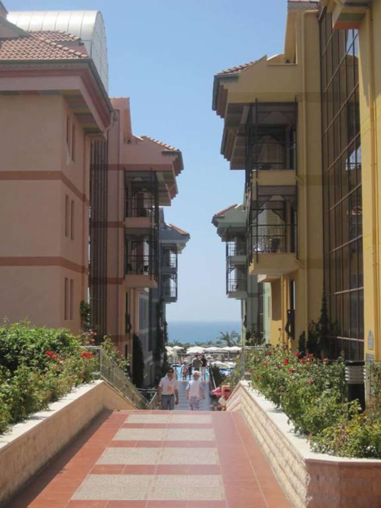 Blick von der Lobby über die Poolanlage zum Meer