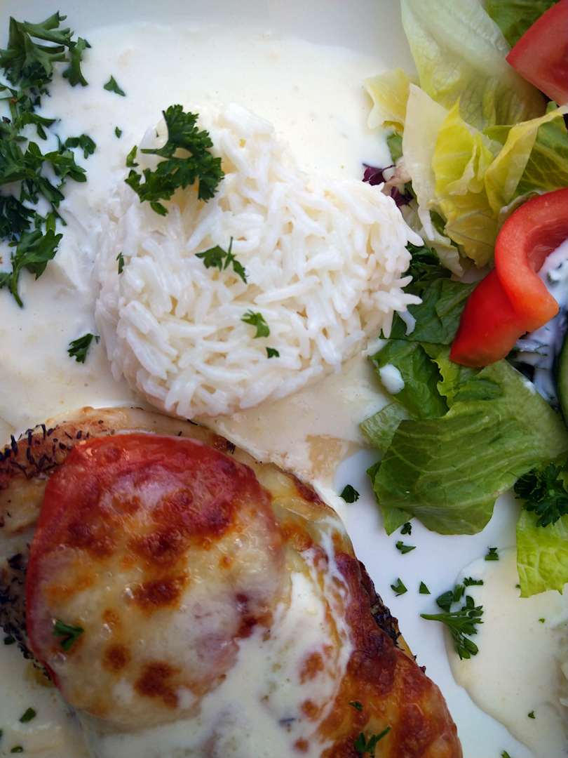 Abendessen - Fleisch mit Käse überbacken, Reis, Salat zum Abendessen