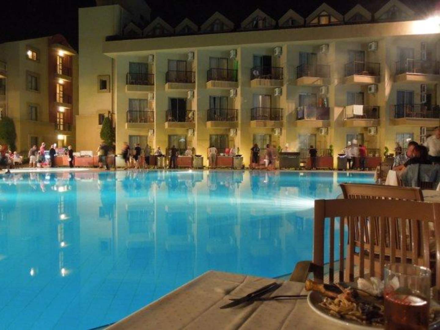 im Hintergrund gut die Kochstationen zu sehen, um den Pool angeordnet die extra zum Abend aufgestellten Tische, jeden Abend Liegen weg und Tische hin