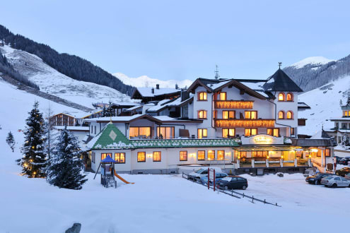 Blick auf das verschneite Hotel in der Dämmerung