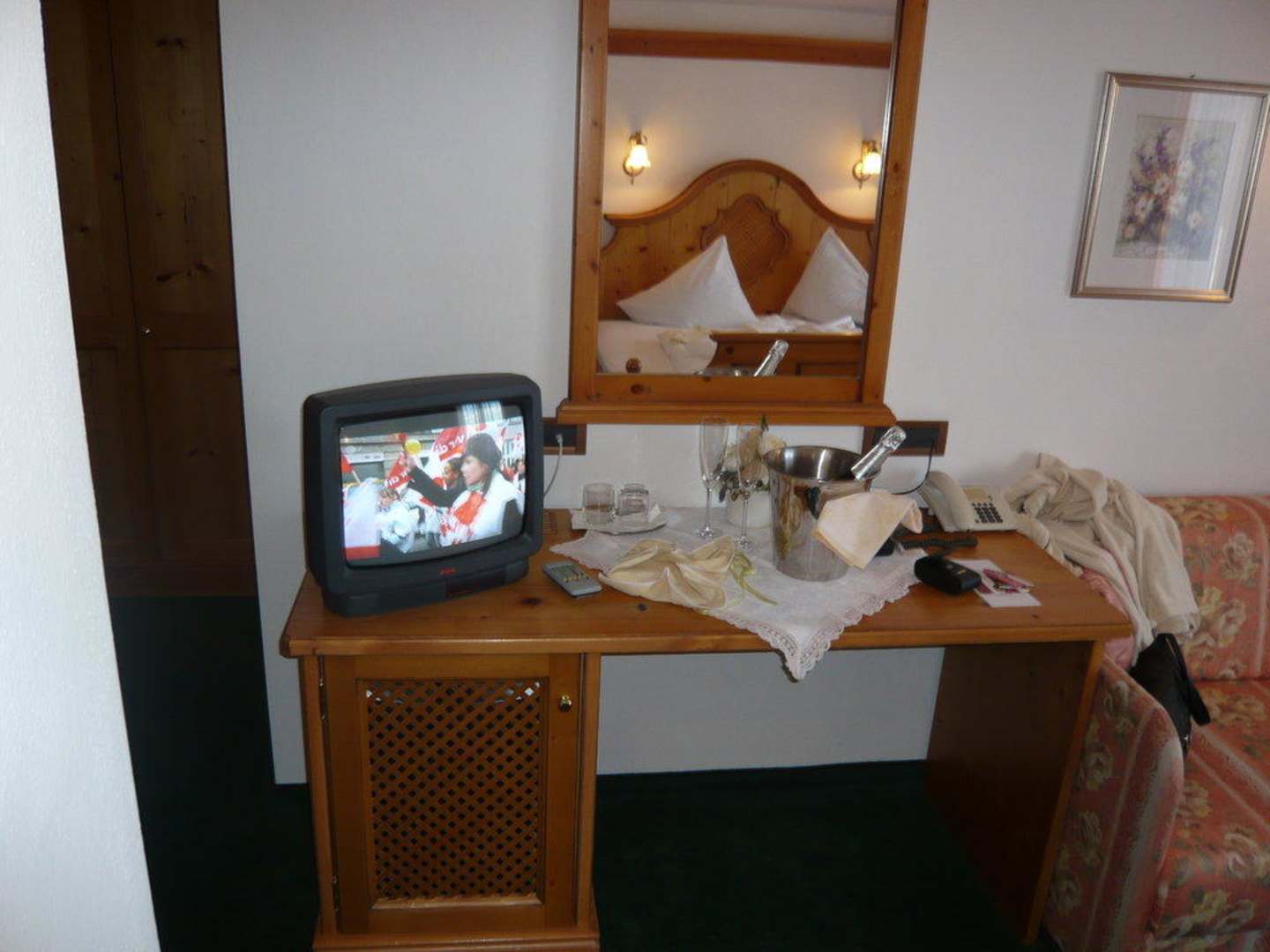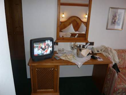 Schreibtisch mit Minibar im Zimmer Tirol